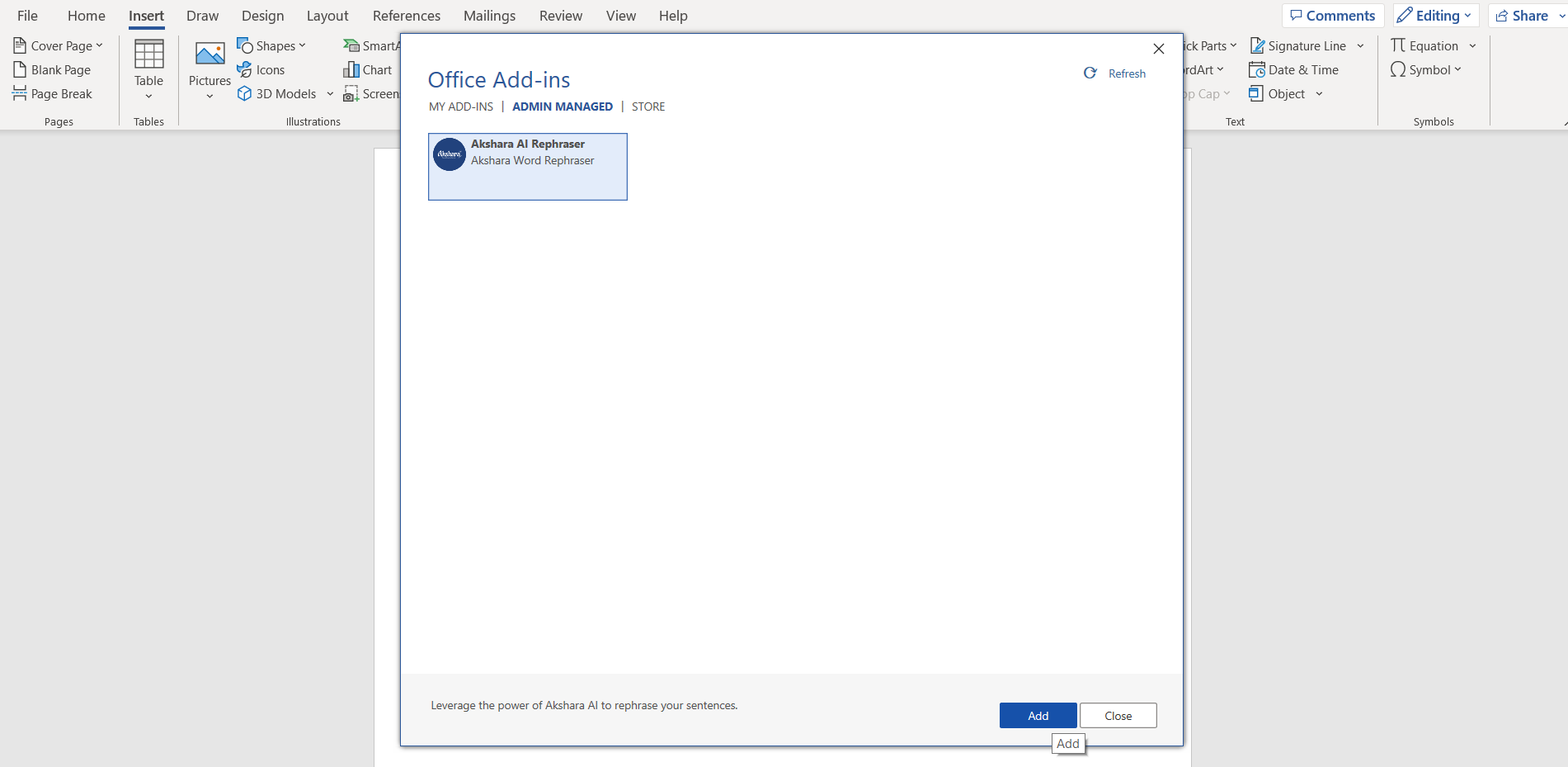 Step 2:By selecting the 'Add-ins' option, you'll find our add-in called 'Akshara Word Rephraser'. Then, you need to click on the 'Add' button to install and use it. You can find it at