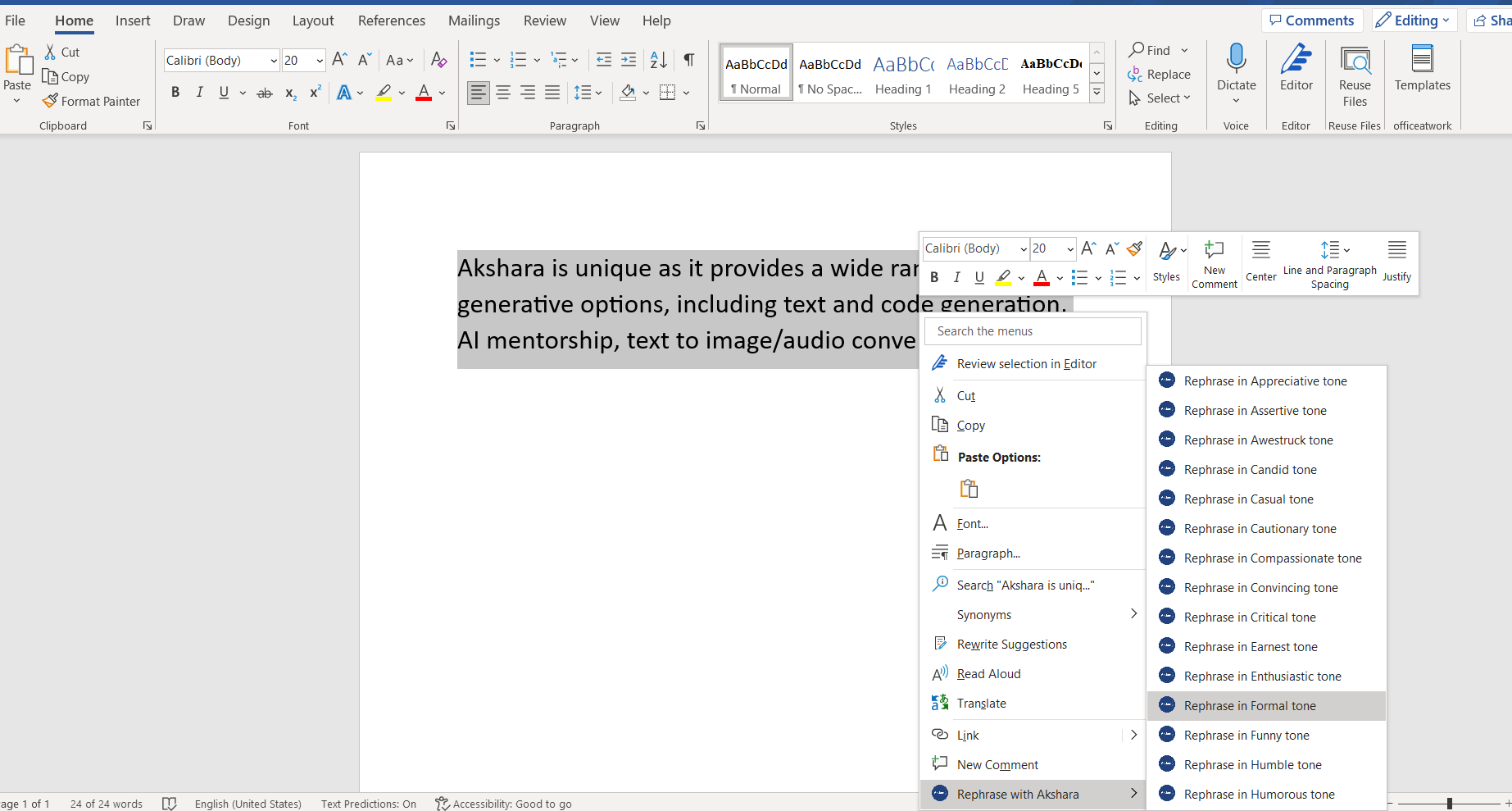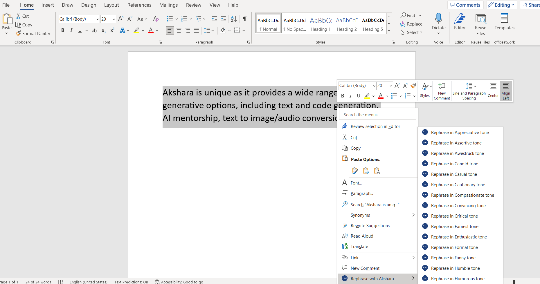 Step 3: After highlighting the desired text, right-click to access a menu. Here, you'll find an option to rephrase using Akshara. Upon selecting this option, a list of available tones will be displayed.